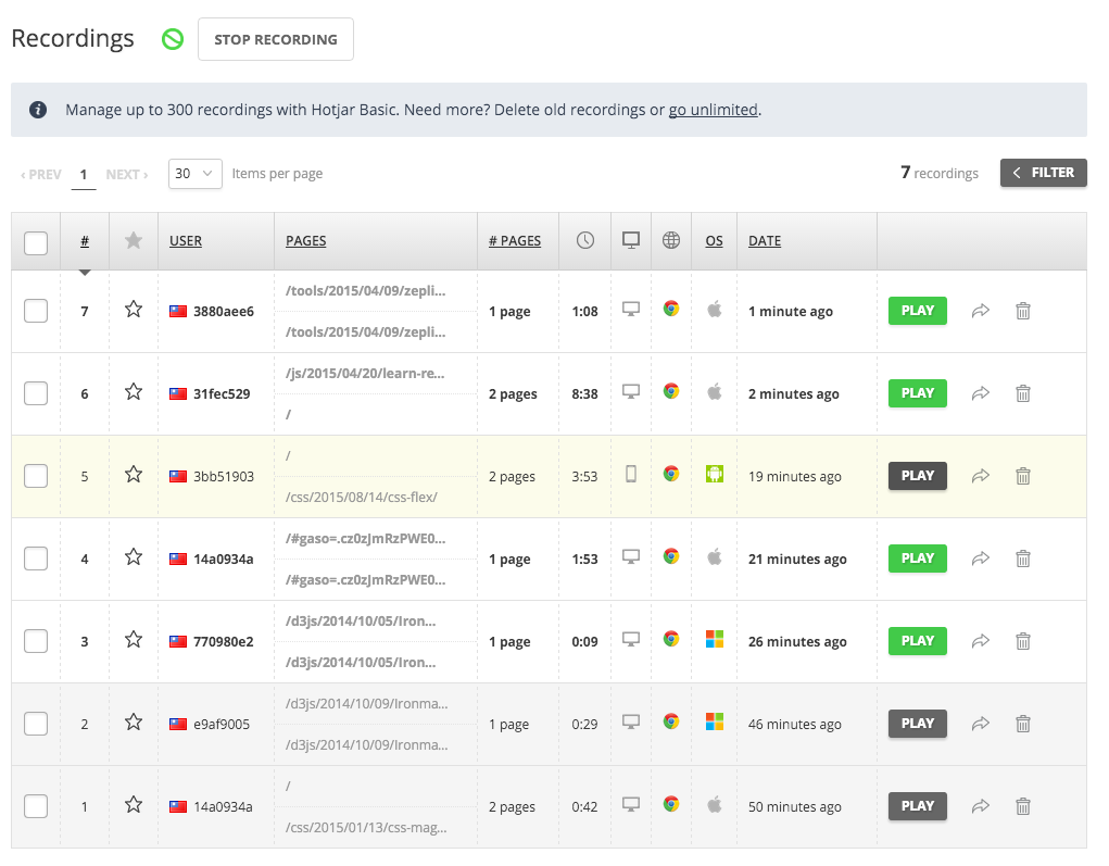 Manage up to 300 recordings with Hotjar Basic. Need more? Delete old recordings or go unlimited.
